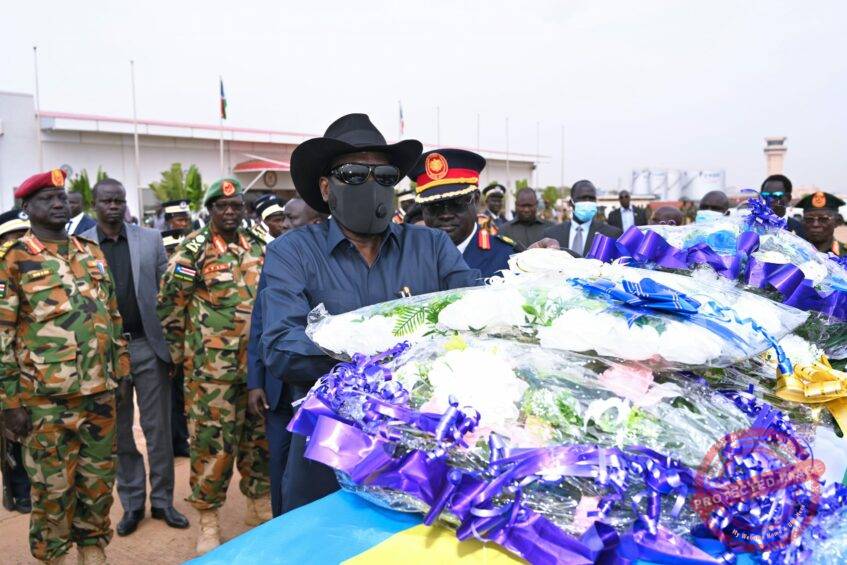 The leaders on Wednesday joined mourners at Juba International Airport to pay their last respect to the late Gen. Salva Mathok Gengdit.