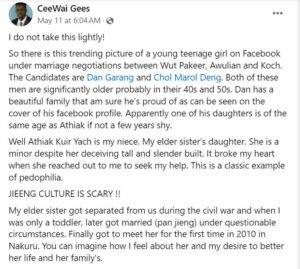 “Athiak Kuir Yach is my niece. My elder sister’s daughter. She is a minor despite her deceiving tall and slender build.