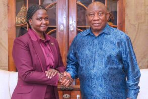 Presidential Envoy on Special Programs Adut Salva Kiir met South African President Cyril Ramaphosa during a courtesy call to his office in...