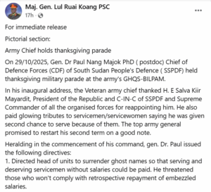 In a statement released by the army spokesperson, Maj. Gen Lul Ruai Koang, Gen. Nang issued reform directives during a Thanksgiving Military Parade at the army’s General Headquarters, Bilpham, on Wednesday, October 29, 2025.