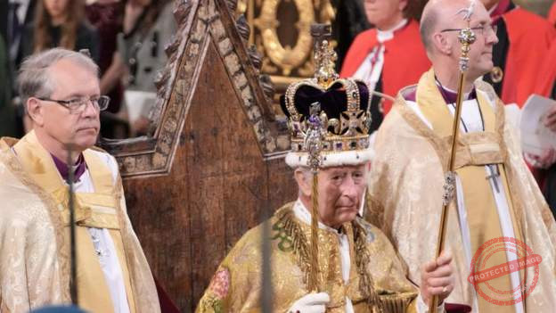 The crowd roared “God save the King”, accompanied by clapping and whooping, as the King was crowned in Westminster Abbey. The also congregation sings a hymn throughout the event.