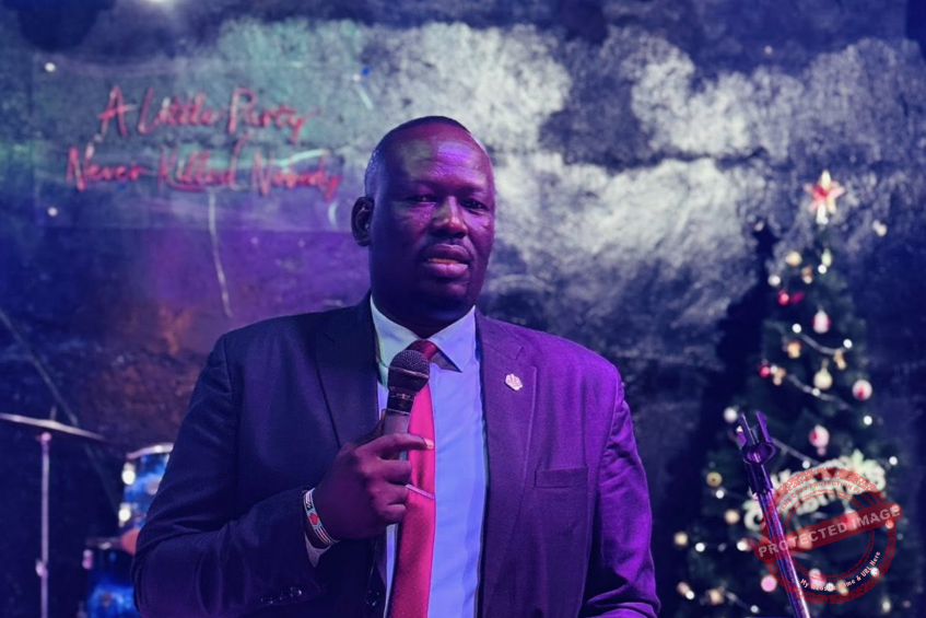 Hon. Emmanuel Tete Ezbon, Commissioner of Juba County, speaks at the South Sudan Bar Association dinner in Juba, Friday, Dec. 19, 2025. (Credit: Juba Giyafa)