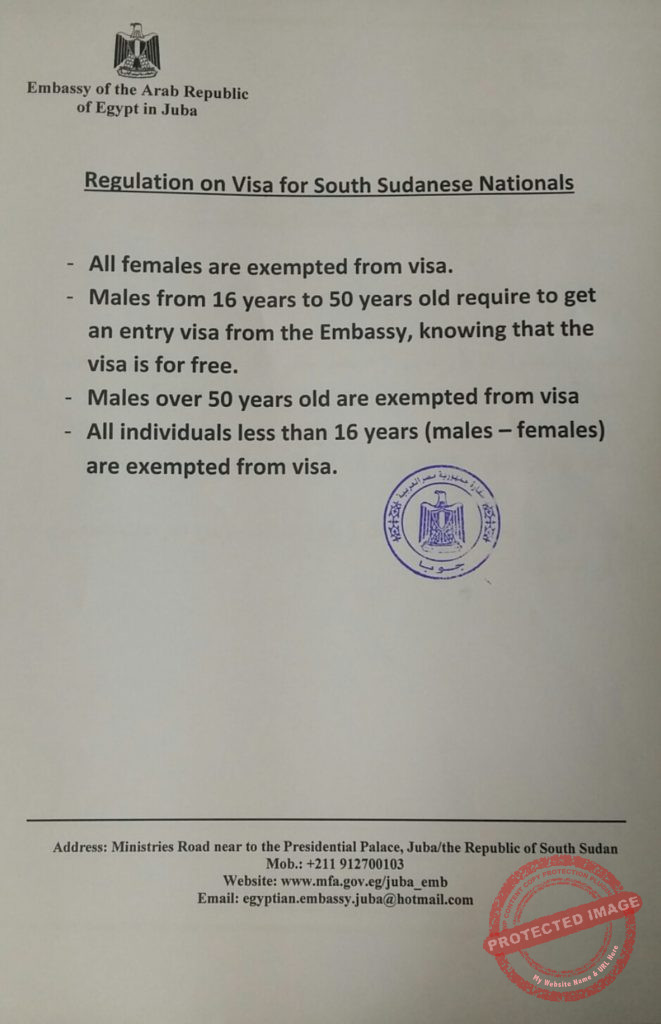 The Egyptian Embassy in Juba has announced visa regulations for eligible South Sudan nationals.