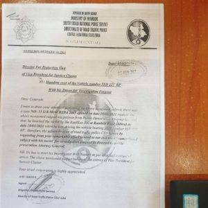 The document was signed by Brig. Daniel Wani Lazarus, the director for Traffic Police in Central Equatoria State under case number 33U/S 50/48 RTPA 2003.