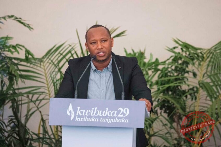 Eric Mwizerwa, a survivor of the 1994 genocide against the Tutsi giving his testimony on April 7,2023 during the 29th commemoration ceremony in Kigali, Rwanda. PHOTO | CYRIL NDEGEYA | NMG