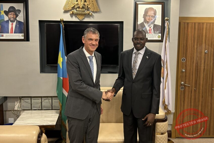 German Ambassador to South Sudan Christian Sedat shakes hands with Finance Minister Dr. Marial Dongrin after a meeting in Juba. August 5, 2024. (Photo: Courtesy).