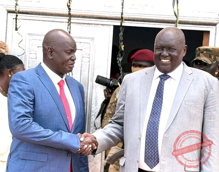 Former Lakes State Governor Rin Tueny Mabor shakes hands with his successor, Madhang Majok Meen, during the handover ceremony in Rumbek, the state capital, on Monday – Courtesy photo.