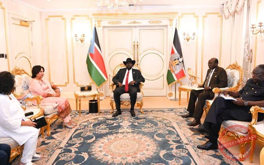 President Salva Kiir (middle), UN Special Representative for Sexual Violence Parmilla Patten (left), Presidential Affairs Minister Marial Benjamin (second right) and Cabinet Minister Martin Elia Lumoro (far right) at the State House J1 on Friday. (Photo: Office of the President | Facebook).