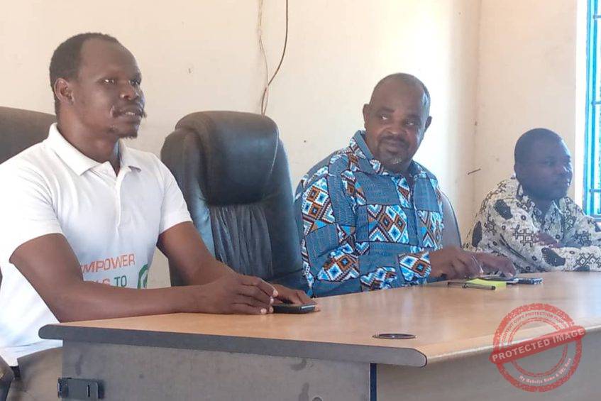 Hussein Enoka, commissioner of Yambio County (middle); Singira, John (right ) mayor of Yambio; and Chief Edward Mombasa during a recent meeting in Yambio county | Credit | Victor Mangu