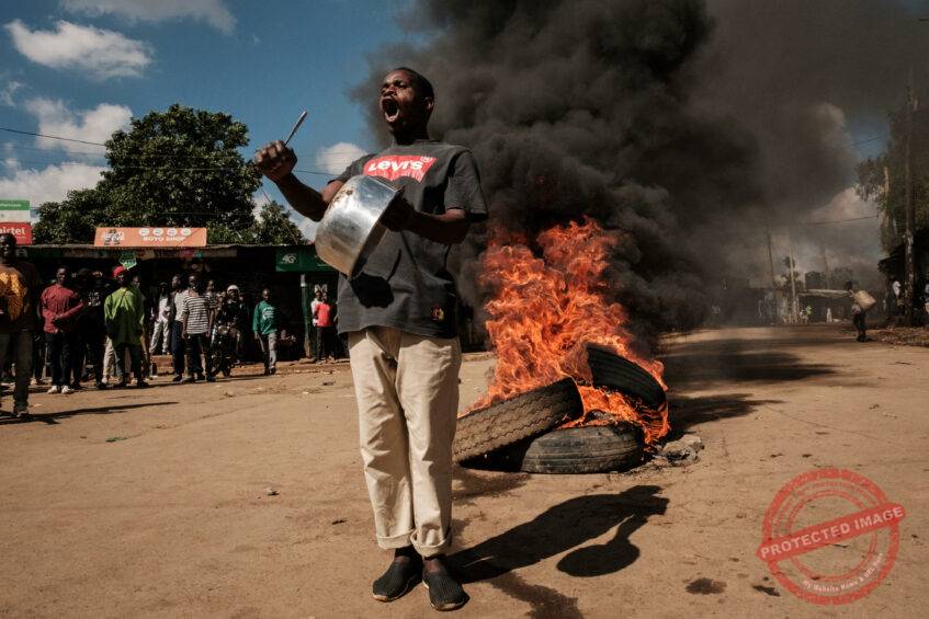 A protester shows an empty pot on the street during a mass rally called by the opposition leader Raila Odinga who claims the last Kenyan presidential election was stolen from him and blames the government for the hike of living costs in Kibera, Nairobi on March 27, 2023. PHOTO/AFP.