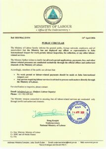 The Ministry of Labour has issued a public circular warning citizens and foreign nationals against engaging with unauthorized individuals offering labour-related services at Juba International Airport.
