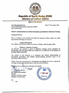 JUBA, South Sudan (Eye Radio) – Minister of Cabinet Affairs Dr Martin Elia Lomuro has announced the formal resumption of the Cabinet sessions this Friday, November 14, 2025, ending a prolonged nine-month halt in regular governmental meetings.
