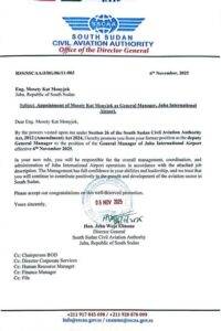 Kat’s formal confirmation comes during a period of ongoing infrastructure reform and security upgrades at JIA, efforts often initiated in close collaboration with Woja, reflecting a broader commitment to enhancing South Sudan’s primary gateway.
