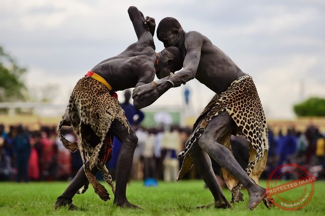 Two wrestlers compete during a national wrestling competition for peace at Juba Stadium on April 20, 2016. Wrestling is a popular sport in Jonglei and the eastern Lakes region. Courtesy of Carl de Souza/AFP