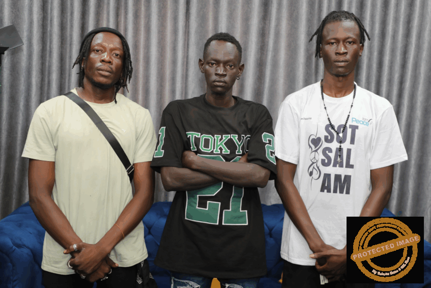 Musicians Yatta Jagana, Elikima Lemy Morris, and Charles Luate (left to right), who were allegedly harassed and had their dreadlocks cut off by security personnel at a checkpoint near Eye Radio on August 4, 2025 - Credit: Moses Awan/Eye Radio
