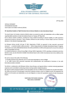 The statement says the two passenger aircraft were diverted to Entebbe due to what it described as low visibility at Juba International Airport.