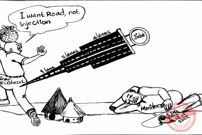 A cartoon depicting controversies that previously marred the Juba-Bahr El Ghazal Highway construction. (Credit: Adija Acuil).
