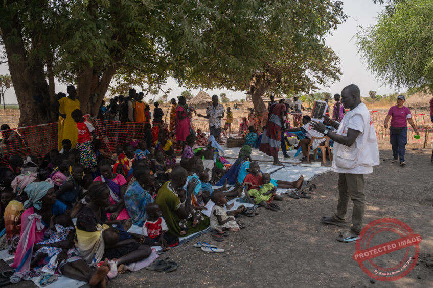 MSF nursing team supervisor David speaks with patients at a mobile clinic in Thanakuach, Jonglei State, South Sudan, where many women have brought malnourished children for screening and treatment on 06/03/2026. Copyright: Isaac Buay/MSF