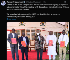 Ugandan media reported that on Friday, May 16, President Museveni hosted a high-level meeting at Fort Portal State Lodge, where delegations from Uganda, South Sudan, and the CAR unveiled plans for a major infrastructure project aimed at boosting regional trade and connectivity.