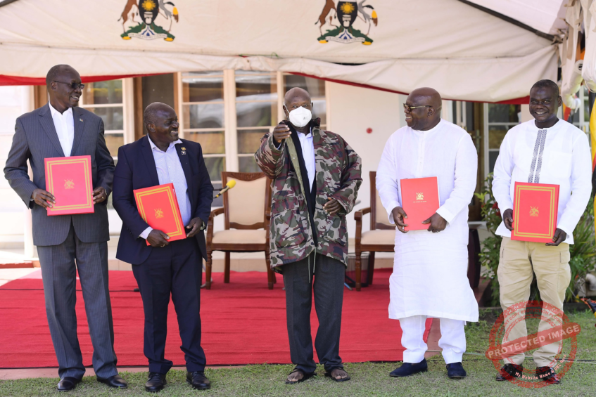 President Museveni (center) with other dignitaries after signing the MoU at State House Entebbe - courtesy