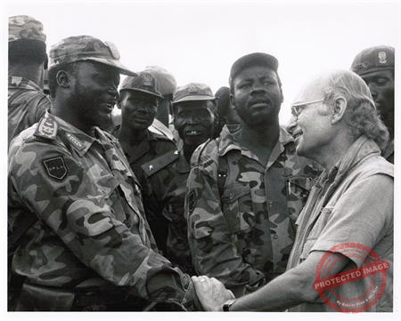 Deceased former US diplomat Roger Winter greets Dr. John Garang De Mabior. (Photo: Reuters).