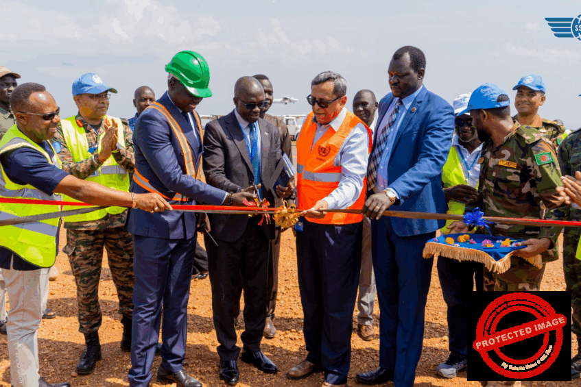 Officials from the South Sudan Civil Aviation Authority (SSCAA) and UNMISS jointly cut the ribbon during the official handover of Phase One of the Juba International Airport Apron Expansion Project. This significant delivery, which took place on Friday, November 14, 2025, strengthens Juba's aviation capacity. (Photo courtesy of SSCAA)