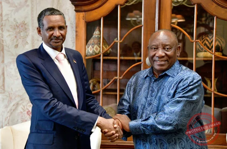 Sudan's paramilitary chief Mohamed Hamdan Daglo (L), with South African President Cyril Ramaphosa (R) in Pretoria, has been greeted as if he were a head of state, analysts say (-)