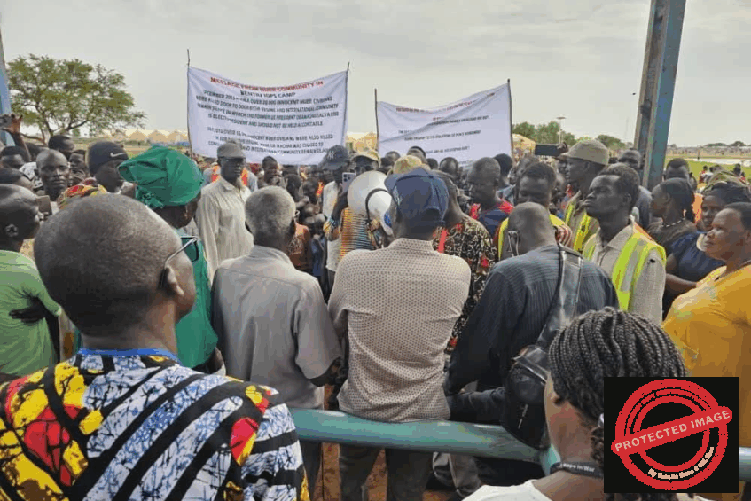 Bentiu IDPs Protest Machar Trial. Internally Displaced Persons (IDPs) in Bentiu, Unity State, stage a demonstration on Thursday, September 25, 2025, to protest the indictment and trial of suspended First Vice President Dr. Riek Machar and his co-accused by the special court in Juba.
