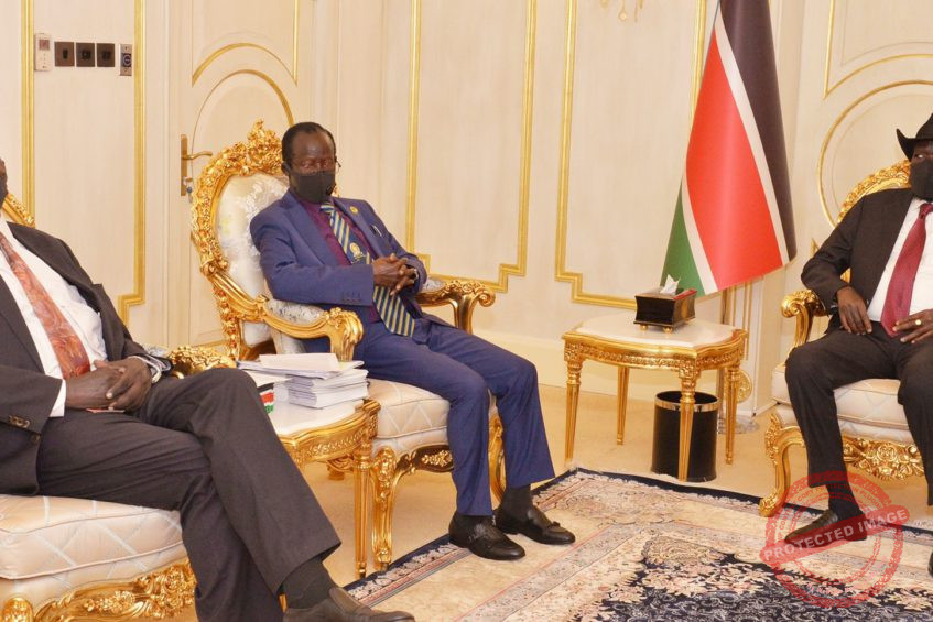 The chairperson of the Jonglei Crisis Management Committee, Dr James Wani and Daniel Awet (member) speak with President Salva Kiir after handing over the report on Monday, May 10, 2021 | Credit | J1
