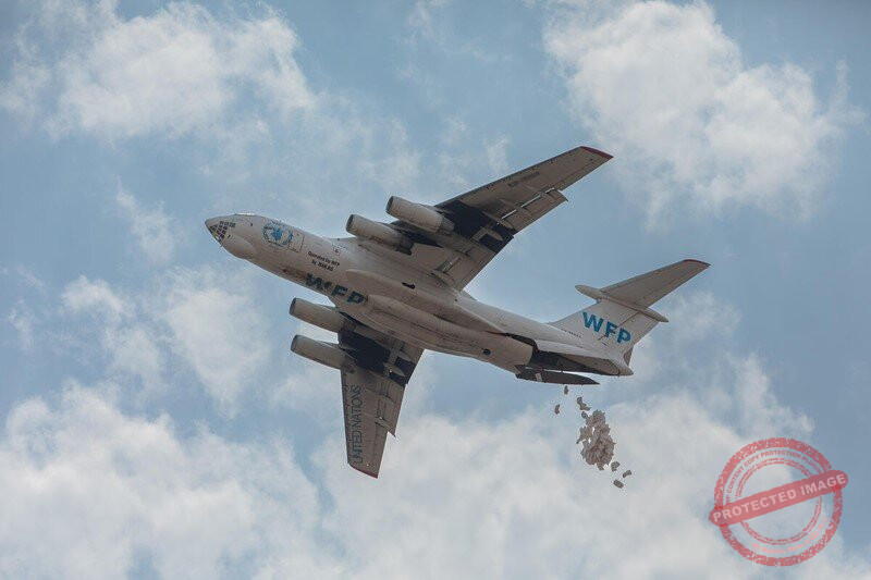 Carefully packaged food parcels drop from a WFP plane onto a designated release zone in a remote area of South Sudan, where a ground team ensures safety and coordinates distribution. Photos: WFP/Samantha Reinders